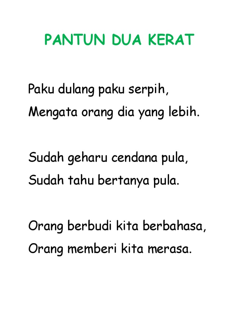 For more information and source see on this link. Wartawan Rasmi Laman Reformasi Dulu Seronok Bahankan Ph Sekarang Pn Kena Pulang Paku. PANTUN TEKA TEKI MARI KITA BELAJAR MEMBACA PANTUN DENGAN INTONASI YANG BETULPANTUN DUA KERAT Paku dulang paku serpih Mengata orang dia yang lebih Pinggan tak retak nasi tak dingin orang tak hendak aku tak ingin PANTUN4 KERAT Paku pakis pucuknya lentik Pokok Pegaga ditimpa dahan Irfan melukis sungguhlah cantik Gambar keluarga menjadi.