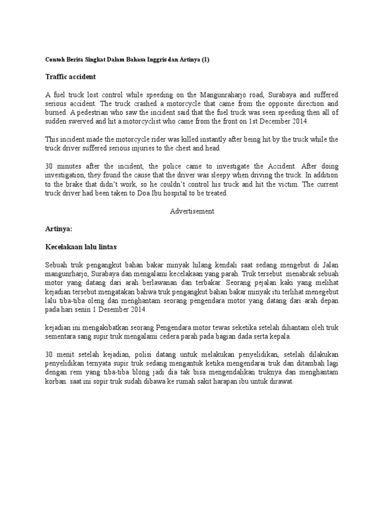 Contoh Berita Singkat Dalam Bahasa Inggris Dan Artinya