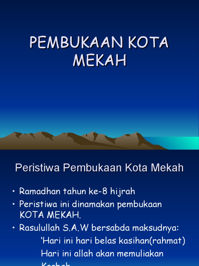 Pembebasan Kota Mekah daripada pengaruh amalan cengkaman jahliyah. Kronologi peristiwa pembukaan kota mekah pada 10 ramadhan tahun ke-8 hijrah rasullullah bergerak ke mekah bersama engan 10000 orang tentera. 1 PEMBUKAAN KOTA MEKAH Muqaddimah Pembukaan Kota Mekah bermaksud.