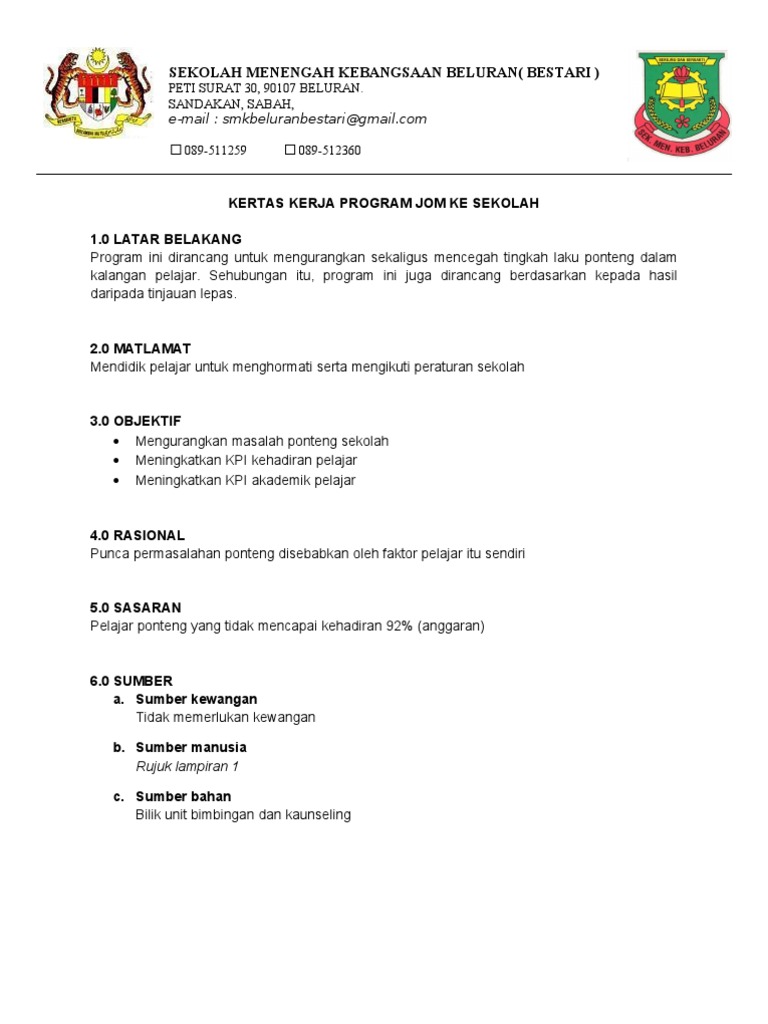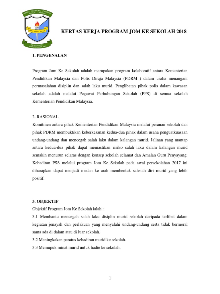 Buku program program jom ke sekolah 2019 1. 0 TUJUAN Kertas kerja ini disediakan adalah sebagai rujukan dan informasi mengenai program Jom Ke Sekolah serta untuk mendapatkan kelulusan daripada Guru Besar supaya program ini dapat dilaksanakan seperti yang dirancang. Menyedarkan para pelajar tentang.