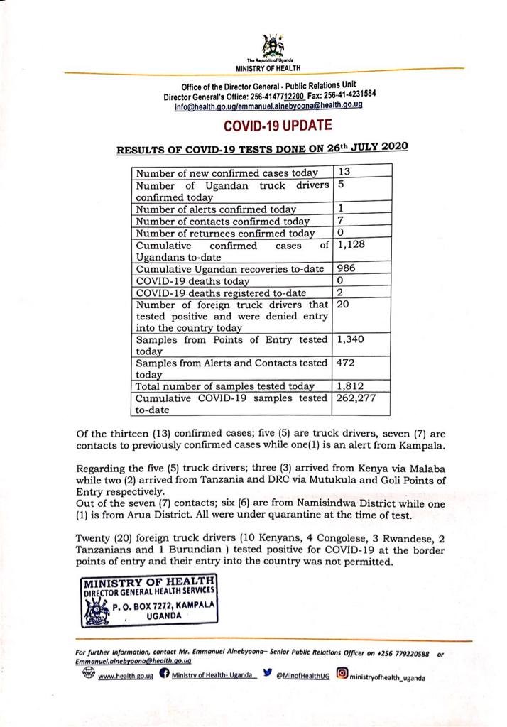 Ministry Of Health Uganda On Twitter Results Of Covid 19 Tests Done On 26 July 2020 Confirm 13 New Covid Cases The Cumulative Confirmed Cases Of Ugandans Is Now 1 128 Https T Co L57ybdosjb