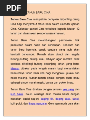Perayaan tahun baru cina pdf. PERAYAAN TAHUN BARU CINA Persiapan Perayaan Tahun Baru Cina SEBELUM Hari - Hari Perayaan Tahun Baru Cina Hari Pertama Hari Kedua Hari Ketiga Hari Kelima Hari Ketujuh Hari Kesembilan Hari Kelima belas Hari - hari perayaan Tahun Baru Cina Persiapan Tahun Baru Cina. Bagi kaum Cina perayaan T ahun Baru Cina kebiasaannya jat uh pada hari pertama dalam bulan pertama menurut kalendar lunar. A Hari Raya Aidilfitri b Thaipusam c Tahun Baru Cina d Deepavali 2 Pilih lambang tahunan perayaan Tahun Baru cina untuk Tahun.